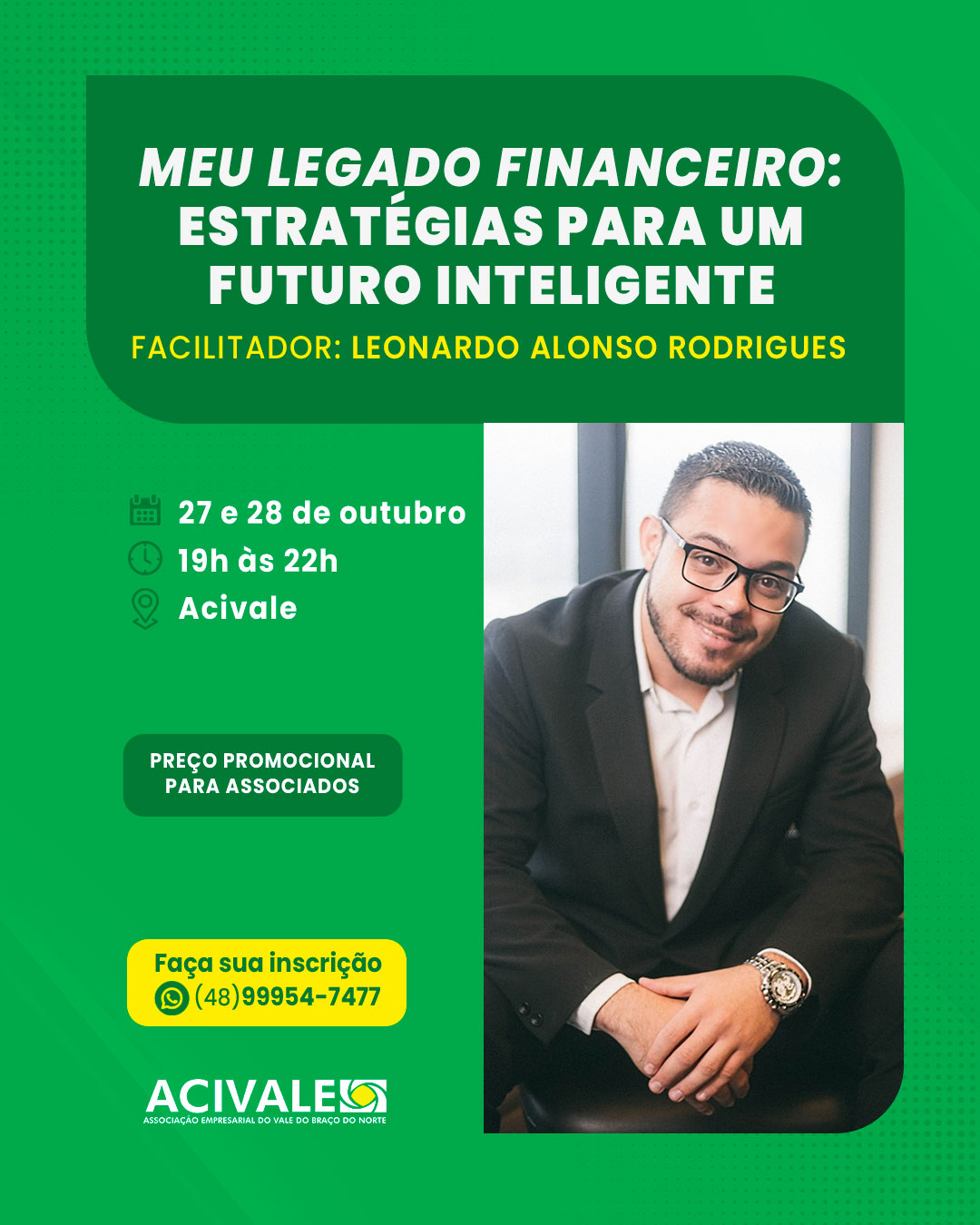 Facilitador, Leonardo Alonso Bacharel em Ciências Econômicas pela Universidade Federal de Santa Catarina (UFSC), foi Economista da Federação das Associações Empresariais de Santa Catarina (FACISC) por 7 anos e é Assessor de investimentos na Blue3/XP Investimentos, somando mais de 10 anos de experiência no mercado, contribuindo assim na tomada de decisões de empreendedores, executivos e investidores. Atualmente assessora na área de economia e indicadores econômicos entidades como Associação Empresarial de Criciúma (ACIC), Associação Empresarial da Região Metropolitana de Florianópolis (AEMFLO), Associação Empresarial de Itapoá (ACINI), Associação Brasileira dos Promotores de Eventos (ABRAPE) e Instituto de Desenvolvimento Econômico Local (IDEL/FACISC).