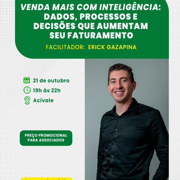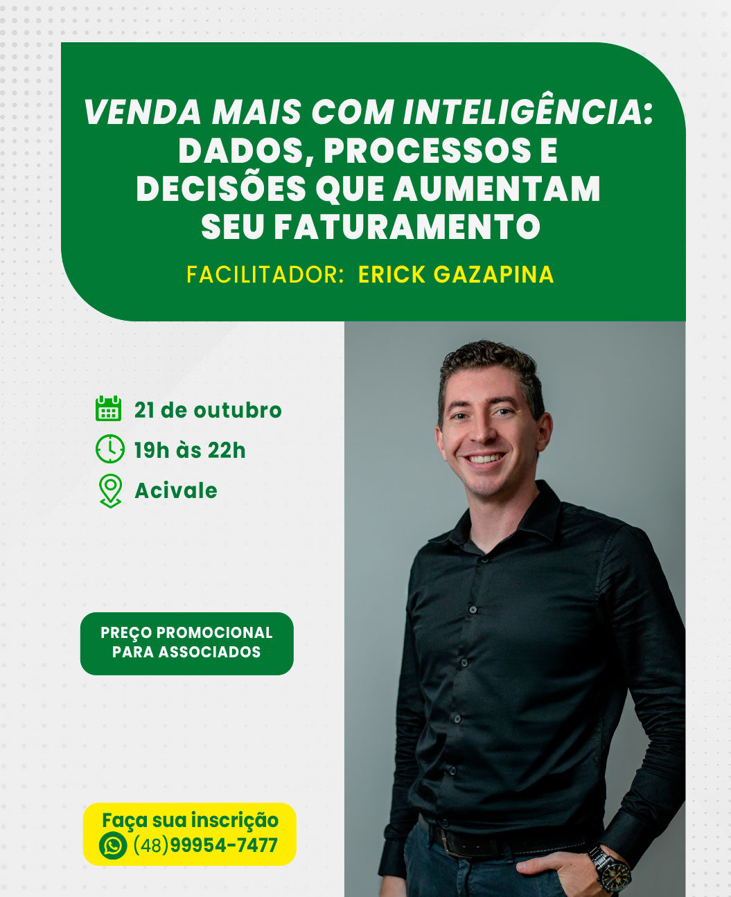 Facilitador, Erick Gazapina Atualmente ocupa a cadeira de vice-presidente da Ajet, a associação de empreendedorismo jovem mais antiga do Brasil.  Consultor empresarial, mentor e palestrante. Formado em Administração, com MBA Executivo em Marketing e Vendas. Autor do e-book “Vamos Alegrar o Dia”, onde compartilha sua jornada real e inspira outros empreendedores a recomeçarem com propósito. Trabalhou em empresas como BRF(Sadia/Perdigão), Parker Migliorini (PMI Foods) e Itagres. Depois de viver um burnout, largou o CLT e empreendeu vendendo brigadeiros por três anos —onde descobriu, na prática, o poder de processos comerciais bem estruturados. Hoje, ajuda empreendedores de todo o Brasil a enxergarem vendas como técnica, não improviso.